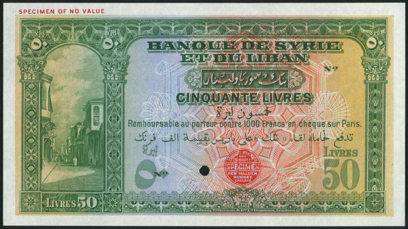 (x) Banque de Syrie et du Liban, colour trial 50 livres, 1 September 1939, green on multicolour underprint, street scene at left, value at each corner, reverse fishing boats at centre, flanked by values, no overprint