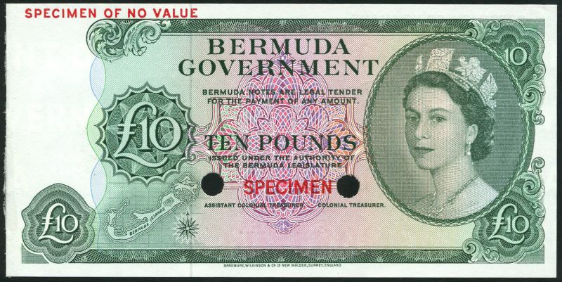 Bermuda Government Issue, colour trial £10, ND (1964), no serial numbers, green and pink and lilac, Elizabeth II at right, map low left, value at centre, left and right, reverse green and pale and brown-orange, arms and value