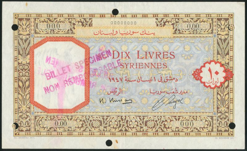 (x) Banque de Syrie et du Liban, specimen 10 livres, 1 April 1947, black zero serial numbers, brown, gold, red and blue, value at right, reverse multicoloured, ruin ar centre left, value at each corner
