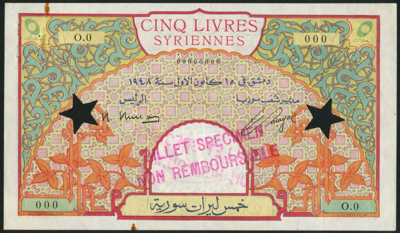 (x) Banque de Syrie et du Liban, specimen 5 livres, 15 December 1948,black zero serial numbers, red, green, orange and pink, ornate design, reverse multicoloured, arched building at centre, value at top left and right