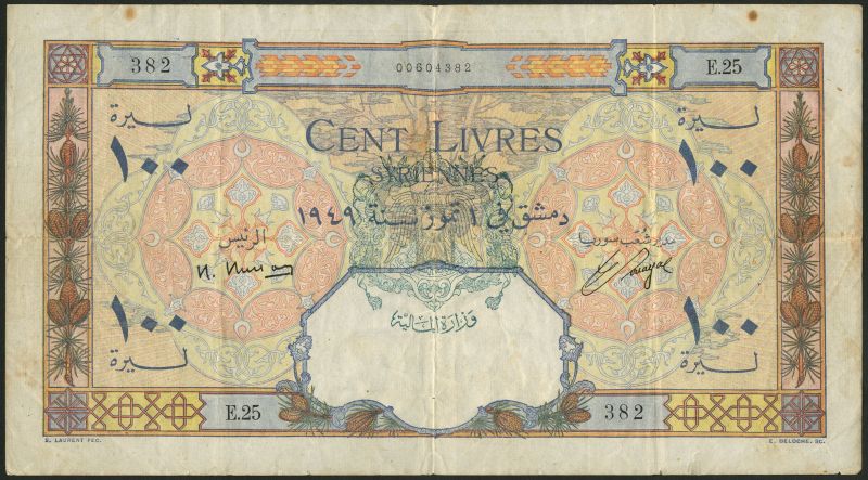 (x) Banque de Syrie et du Liban, Syria, 100 livres, 1949, serial number E.25-382, pale pink and multicoloured, ornate background detail, green state arms and 'Ministry of Finance' handstamp at top centre, Busson signature at left, reverse blue and multicoloured, view of Damascus at centre, incense burner at left and right
