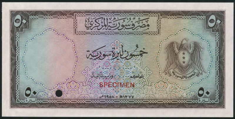 Banque Centrale De Syrie, colour trial 1 livre, 1957, violet and multicoloured, also colour trial 50 livres, 1958, dark brown, blue-green and multicoloured, both arms at right
