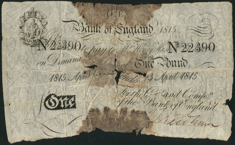 Bank of England, Henry Hase, £1, 13 April 1815, serial number 22390, black and white, ornate vignette of Britannia at top left, value in tablet at low left