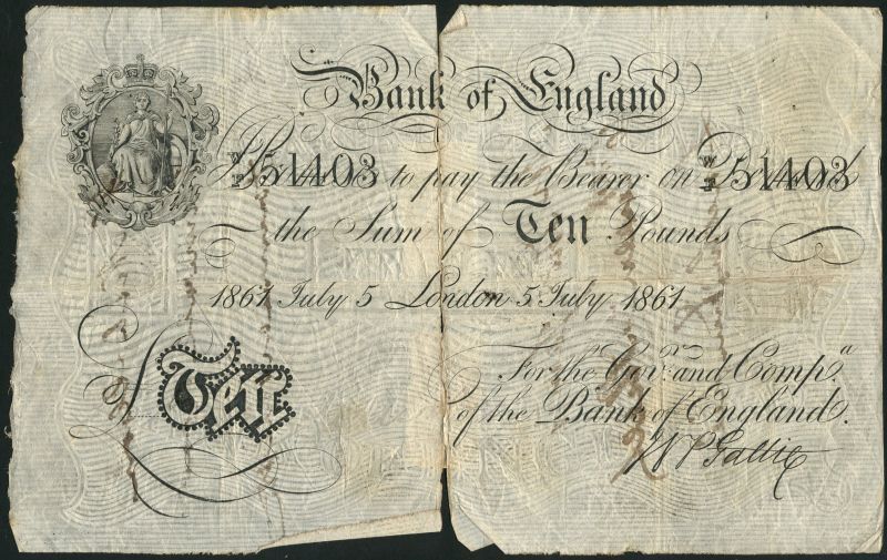 (x) Bank of England, Matthew Marshall, a contemporary forgery of a £10, London, 5 July 1861, serial number W/F 51403, black and white, ornatte crowned vignette of Britannia top left, printed signature of W.P.Gattie