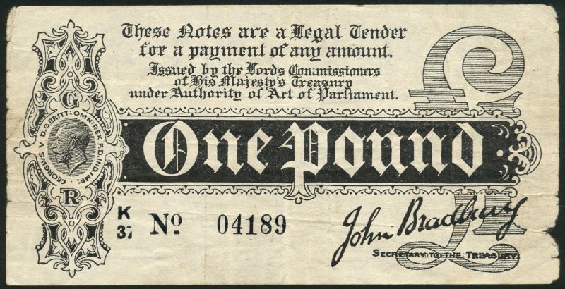 Treasury Series, John Bradbury, £1, ND (1914), serial number K/37 04189, black, George V at left, value in tablet at centre