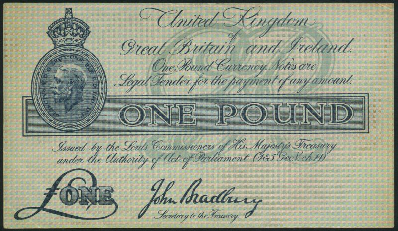 United Kingdom Treasury issue, trial £1, ND (ca 1916/1917), blue-green, crowned head of George V at left, value in pale blue panel at centre, GR elided in underprint at centre, chequerboard pattern in background, printed signature of John Bradbury low centre