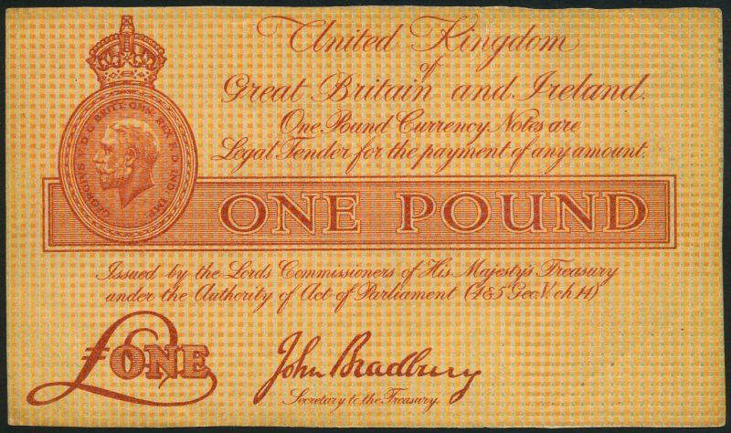 United Kingdom Treasury issue, trial £1, ND (ca 1916/1917), red and orange, crowned head of George V at left, value in pale blue panel at centre, GR elided in underprint at centre, chequerboard pattern in background, printed signature of John Bradbury low centre