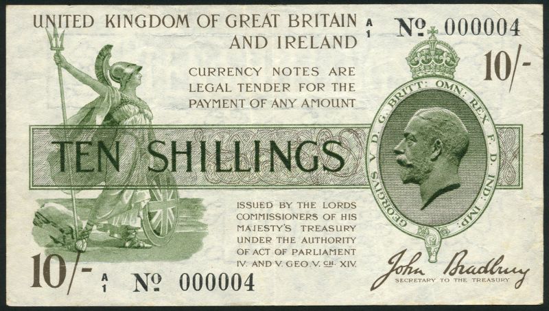 Treasury Series, John Bradbury, 10/-, ND (22 October 1918), serial number A/1 000004, brown, green and purple, George V at centre right, Britannia at left, value in ornate tablet at centre and at low left and top right