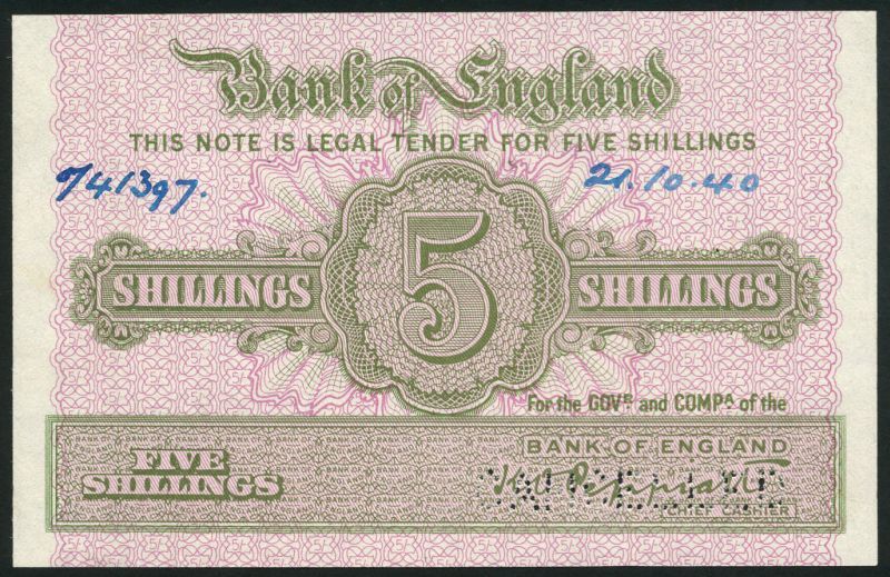 (†) Bank of England, 5/- ND (1941), unissued emergency wartime fractional, olive on pink underprint, value in guilloche at centre on obverse and reverse, signature K.O.Peppiatt, perforated CANCELLED