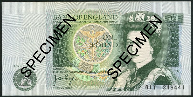 Bank of England, (J.B.Page), £1 (2), ND (1978), serial numbers 81T 348441/442, green and orange, Elizabeth II at right, caduceus top centre, Britannia low left, reverse Sir Isaac Newton right centre
