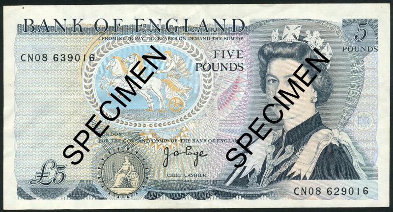 Bank of England, (G.O.Page), £5, ND (1973), mismatched serial numbers CN08 639016 and CN08 629016, blue on multicolour underprint, Elizabeth II at right