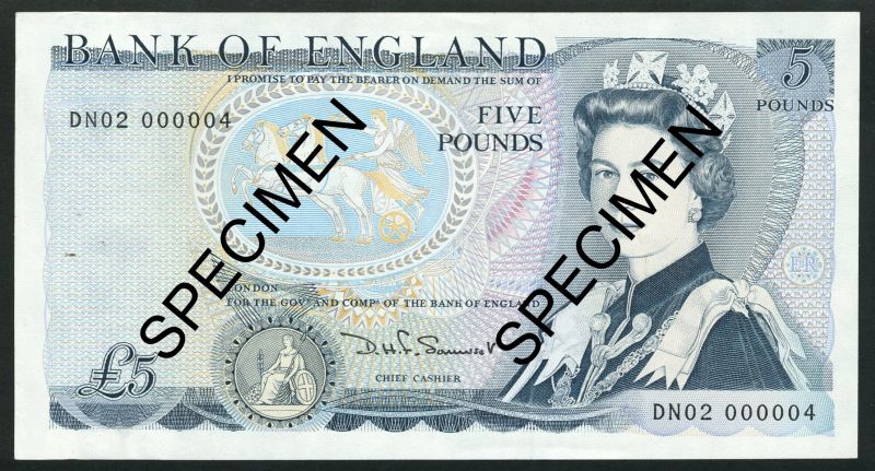 Bank of England, D.H.F.Somerset, £5 (48, ND (1970), serial numbers DN 02 000004/5/6/7, blue and white, Elizabeth II at right, Victory in biga top centre
