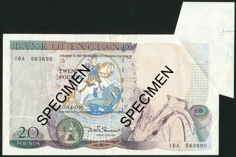 Bank of England, D.H.F Somerset, £20, ND (1984), serial number 16A 563690, purple and multicoloured, Elizabeth II at right, Saint George and the dragon at centre, reverse 'Romeo and Juliet'