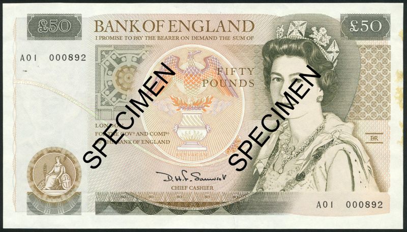 Bank of England, D.H.F Somerset, £50, ND (1981), serial number A01 000892, green and multicoloured, Elizabeth II at right, phoenix at centre, reverse green and multicoloured, Sir Christopher Wren and Saint Pauls at centre