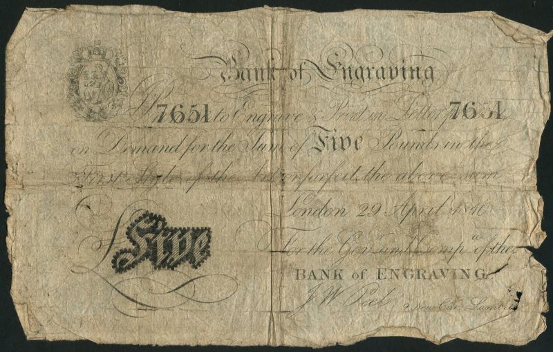 (x) Bank of Engraving, £5, 1840, £50, 1840, both black and white with vignette of Britannia top left in the style of the Bank of england issues of the period, also a £1 skit note dated 186- for A.Lynn's coat depot