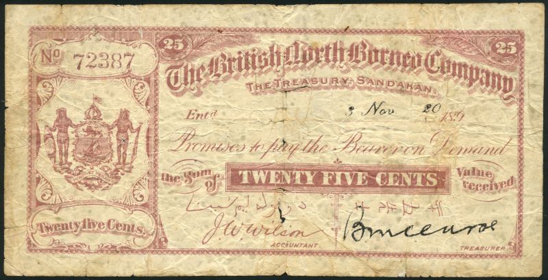 (x) British North Borneo Company, 25 cents, Sandakan, handstamped date 3 November 1920 (189-), serial number 72387, mauve on white, arms at left, one printed (Wilson) and one manuscript signature below