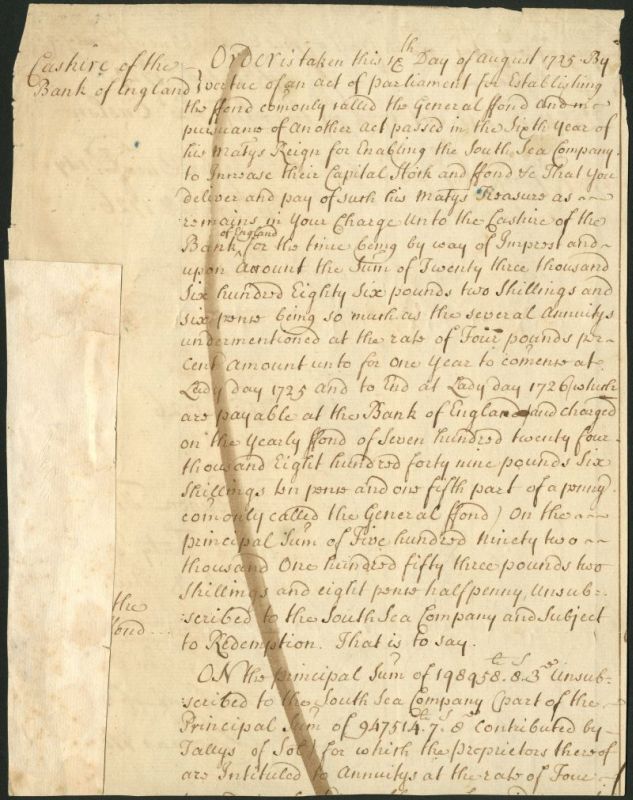 Bank of England (Thomas Madockes 1699-1739), exchequer order dated 16 August 1725, relating to annuities of the South Sea Company charged on the General Fund of the Bank of England. The order has been reciepted on the reverse on 13 October 1725, 6 April 1726 and 14 April 1726, and signed for the Governor and Company of the Bank of England by Thomas Madockes