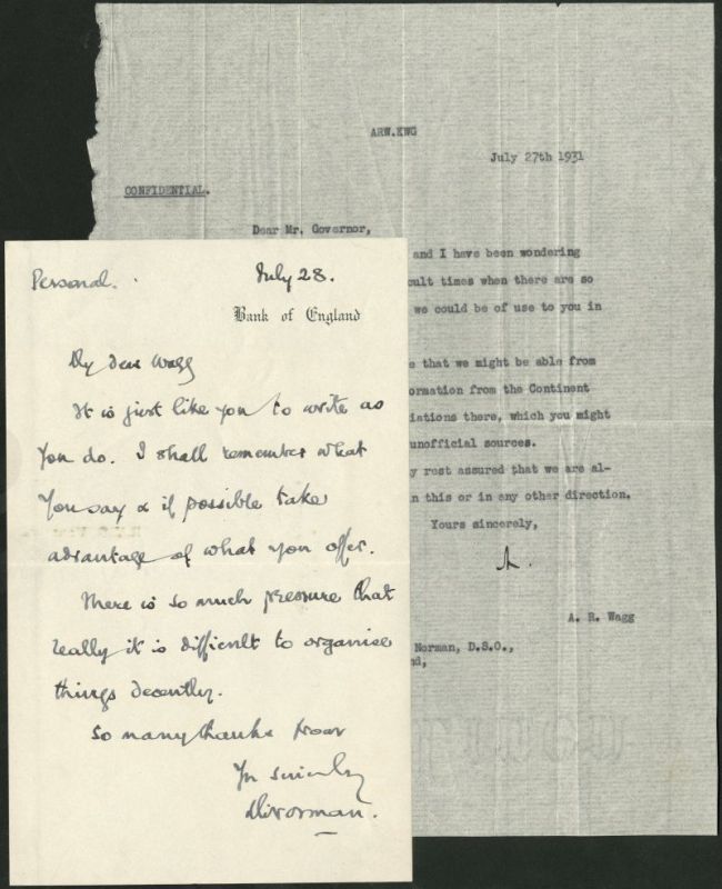 Two personal letters between Montagu Norman, Governor of the Bank of England, and Alfred Wagg, Chairman of the merchant bankers Helbert, Wagg. Dated 27th and 28th of July 1931 respectively, the initial letter, from Wagg, offers possible sources of unofficial information as the 1930's depression developed. The hand written reply, addressed 'My Dear Wagg', thanks him for his offer and is suitably noncommittal,
