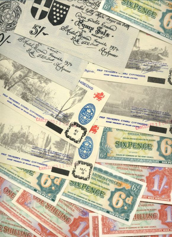 Great Britain, a selection comprising Newcastle upon Tyne £1, 1803, £5, 1840 and £10, 1838, a part issued Stornaway £1, 1823, British Armed Forces, second series, 3D (6),6D (7),1/- (9), all with board wrapper, BMA 1/- and 10 lire, British Linen Bank £1, 1967, Belfast Banking Comapny £1, 1939, 5/-,10/- and £1 Cornwall issue, 1974 and Welsh private issues (5)