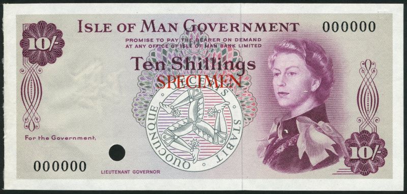Isle of Man Government issue, colour trial 10 shillings, ND (1961), zero serial numbers, purple and multicoloured, Elizabeth II at right, triskeles at centre, reverse purple, Viking longship at centre