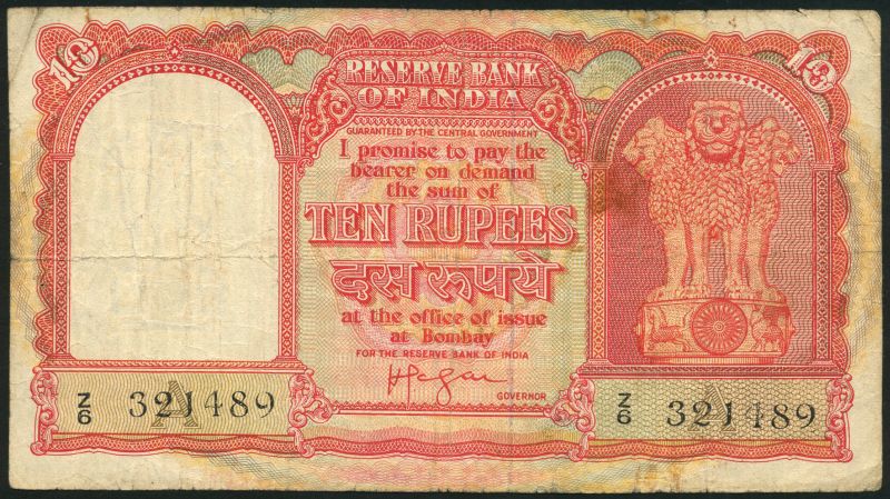 Reserve Bank of India, Persian Gulf Issue, 10 rupees, ND (1959), serial number Z/6 321489, red-orange on multicolour underprint, Asoka Column at right, value at centre and top corners, Lengar signature, reverse sailing ship at centre
