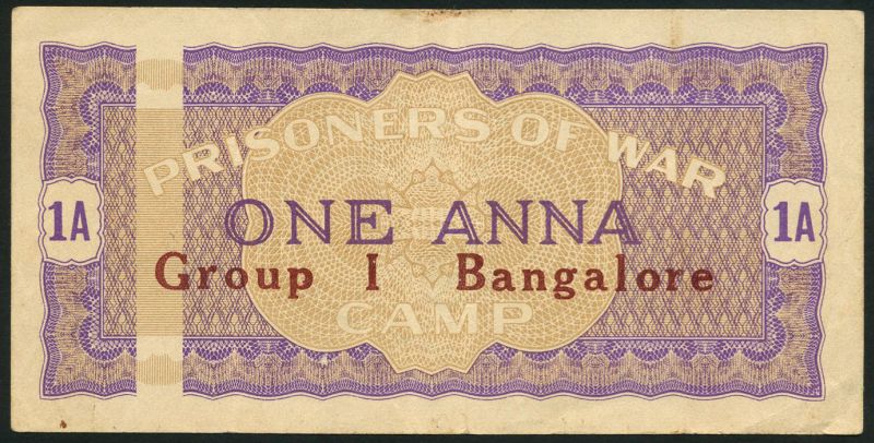 Prisoner of War Camp money, India, 1 anna, Bangalore, ND (1939-1945), violet and pale brown, GROUP 1 Bangalore in red-brown at centre with bar at left