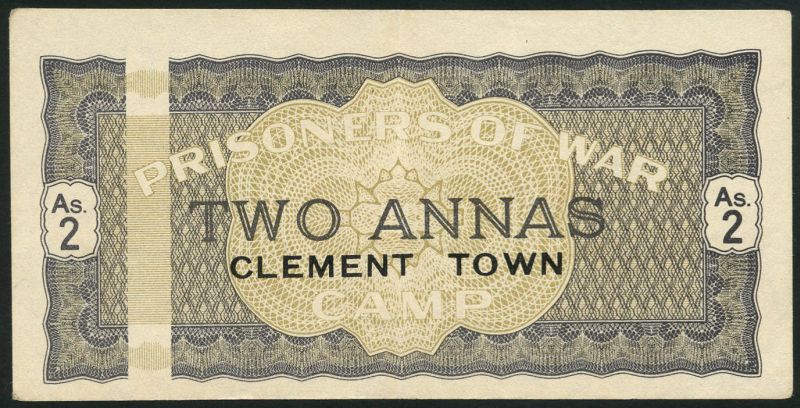 Prisoner of War Camp money, India, 2 annas, Clement town, ND (1939-1945), blue, CLEMENT TOWN in black at centre with bar at left