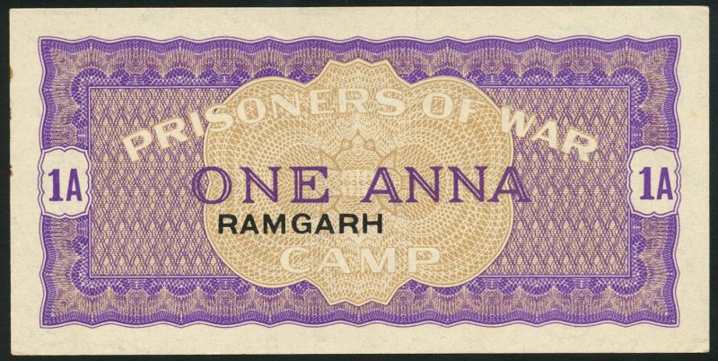 Prisoner of War Camp money, India, 1 anna, Ramgarh, ND (1939-1945), blue, RAMGARH in black at centre without bar at left, reverse purple handstamp P.O.W.CAMP XX