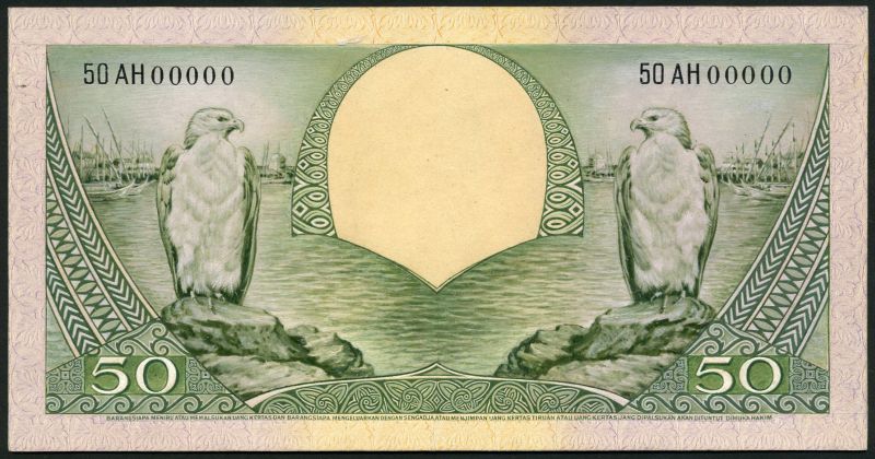 (†) Bank Indonesia, uniface reverse partially hand-executed essay on card, 50 Rupiah (ca1959), serial number 50 AH00000, green, pale lilac and yellow, white-bellied fish eagles at right and left, denomination at lower right and lower left