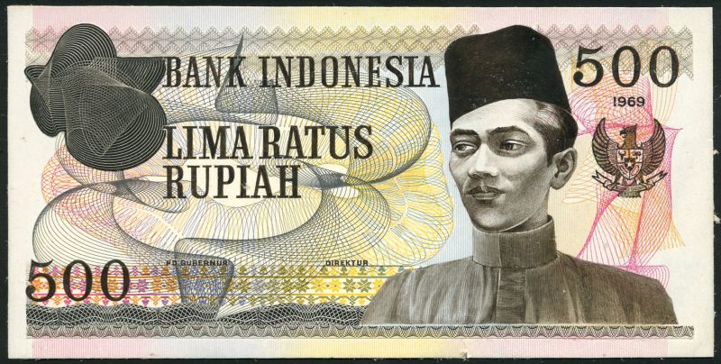 (†) Bank Indonesia, an obverse composite essay for a 500 rupiah, 1969, dark brown and multicoloured, young man at left, arms top right