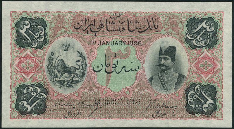 (†) Imperial Bank of Persia, specimen 3 tomans, 1 January 1896, serial number C 20001-C 70000, pink, black and green, Imperial arms at left, Shah Nasr ed-Din at right, value at centre and at each corner, reverse blue, Imperial arms and value
