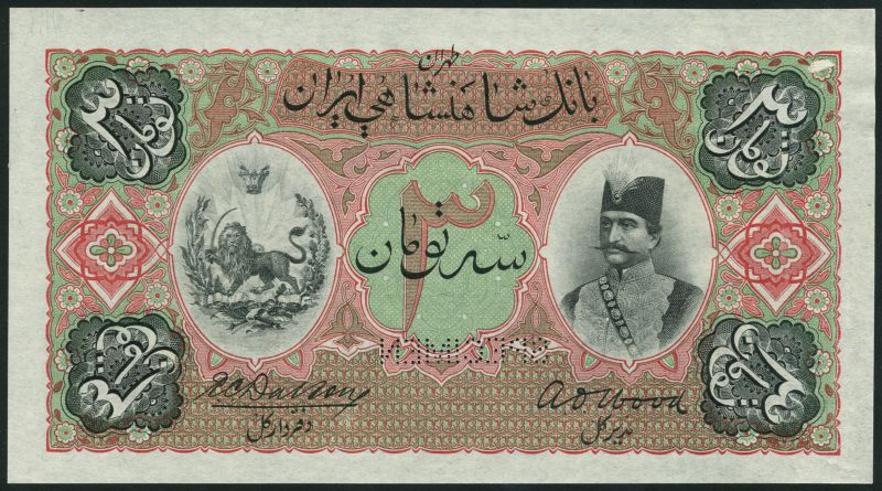 (†) Imperial Bank of Persia, printer's archival specimen 3 Tomans, ND (1890-1923), serial run Q/A 000001 to 025000, black, pink and light green, portrait of Nasr al-Din, Shah Qajar at right, imperial seal at left, reverse blue, imperial seal at centre set in ornate guilloches with denomination in all four corners, perforated SPECIMEN