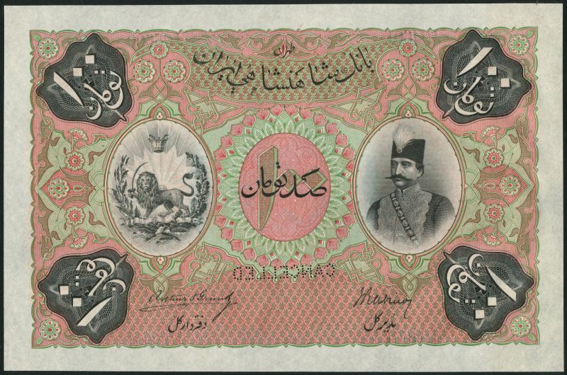 (†) Imperial Bank of Persia, printer's archival specimen 100 Tomans, ND (1890-1923), serial run J04601 to 05600, black, pink and light green, portrait of Nasr al-Din, Shah Qajar at right, imperial seal at left, reverse orange, imperial seal at centre set in ornate guilloches with denomination in all four corners, perforated CANCELLED