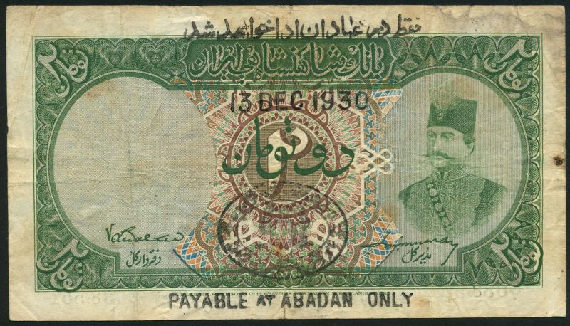 Imperial Bank of Persia, 2 tomans, Abadan, 13 September 1930, serial number B/Y 038551, green and multicoloured, Shah Nasr ed-Din at right, reverse red and blue, value in field