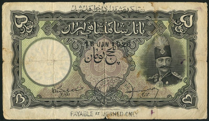 Imperial Bank of Persia, 5 tomans, Meshed, 16 January 1926, serial number C/K 016886, black,green and lilac, Shah Nasr ed-Din at right, reverse green, value in field