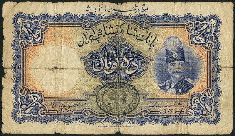 Imperial Bank of Persia, 10 tomans, Teheran, 26 May 1928, serial number D/A 099775, blue, orange and pale yellow, Shah Muzzaffar-al-Din at left, value at centre and at each corner, reverse red and white, value at centre and at left, serial number at each corner