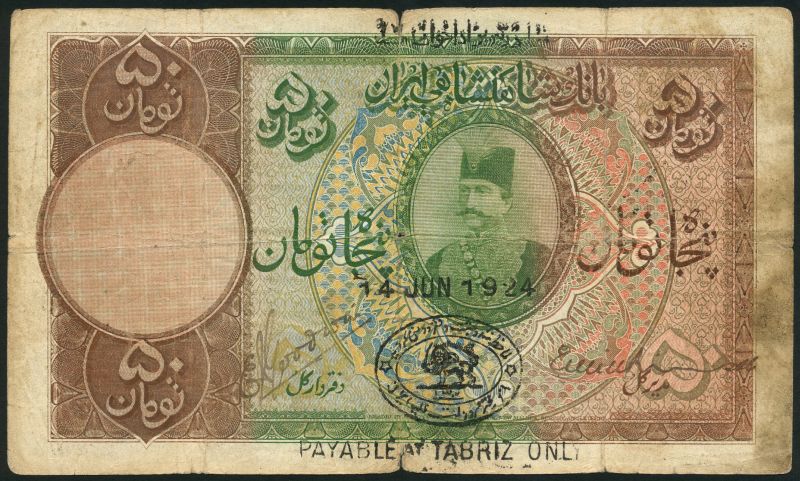 (x) Imperial Bank of Persia, 50 tomans, Teheran, 15 June 1924, red serial number F/B 025105, brown, green, pink and pale orange, Shah Muzzaffar-al-Din top right centre, value at centre and at each corner, 'PAYABLE AT TABRIZ ONLY', manuscript signature low left and right, reverse purple-brown and green, value at left and at each corner, serial number at each corner