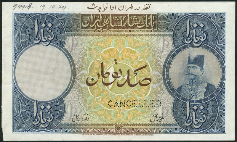 (†) Imperial Bank of Persia, specimen 100 tomans, Teheran, ND (ca 1924), red serial number G/A 000001-G/B 025000, blue, mauve and green and orange, Shah Nasr ed-Din at right, value at centre and at each corner, reverse blue and purple-brown, Imperial arms at centre, value at left and at each corner