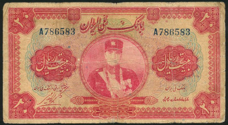 Bank Melli Iran, 5 rials, green, 10 rials, brown and 20 rials, red, all AH 1311 (1932), all Shah Reza facing in military cap in field