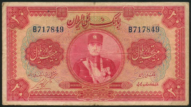 (x) Bank Melli Iran, 20 rials, 1932 issue, serial number B717849, red on multicolour underprint, Shah Reza at centre, value at each corner, reverse red, Imperial Lion with sword and crown at centre