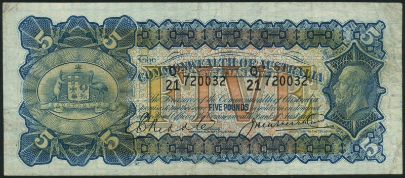 Commonwealth of Australia, £5, ND (1927), serial number Q/21 720032, blue and multicoloured, arms at left, head of George V at right, Riddle and Heathershaw signatures, reverse blue, the Hawkesbury river at centre