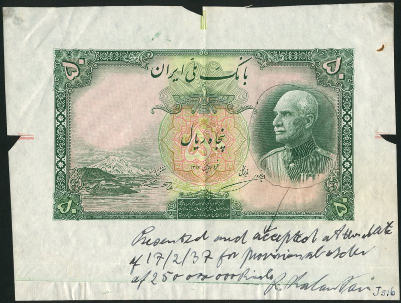 (†) Bank Mellie Iran, obverse and reverse uniface proof on large format paper for a 50 rials, AH 1316 (1937), no serial numbers, green and pink, Shah Reza at right, mountains at left, Great King and wings at centre, value at centre and at each corner, reverse green and pale orange, ruins at centre, Imperial arms top left, value at each corner