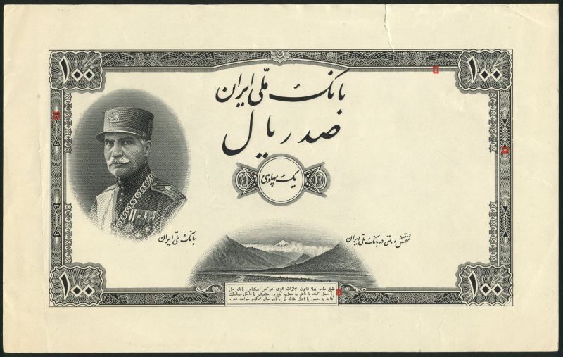 (†) Bank Melli, Iran, an obverse die proof for a 100 rials, ND (1935), black and white, Shah Reza in military cap at left, Mount Damavand low centre, value at each corner
