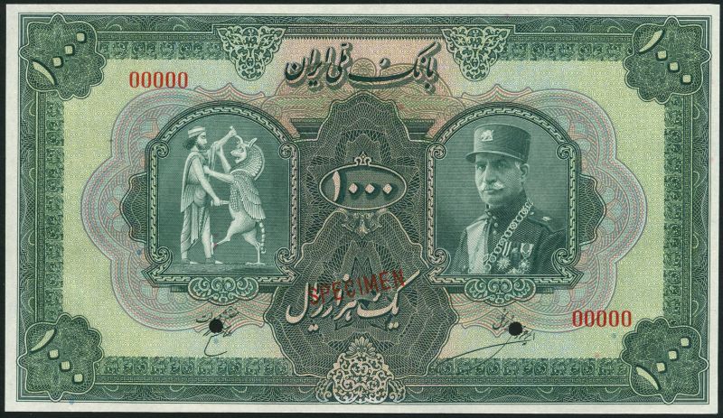 (x) Bank Melli Iran, a specimen set of the ND (1933-34, AH1312-13) issue, comprising specimen 5, 10, 20, 50, 100 and 1000 rials, all with Shah Reza in military uniform on obverse, arms on obverse