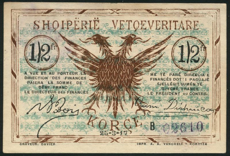 Albania regional issues - Korce, Series C, 1/2 franc, 1 March 1917, blue serial number A 02023, brown on green underprint, 1/2 franc , 25 March 1917, blue serial number B 02610, and 1/2 franc, 10 October 1917, black serial number C 01724, all with double headed eagle at centre, flanked by value, also 1/2 skender, brown, red and white and 1 skender, red, green and white, both Skanderbeg at left