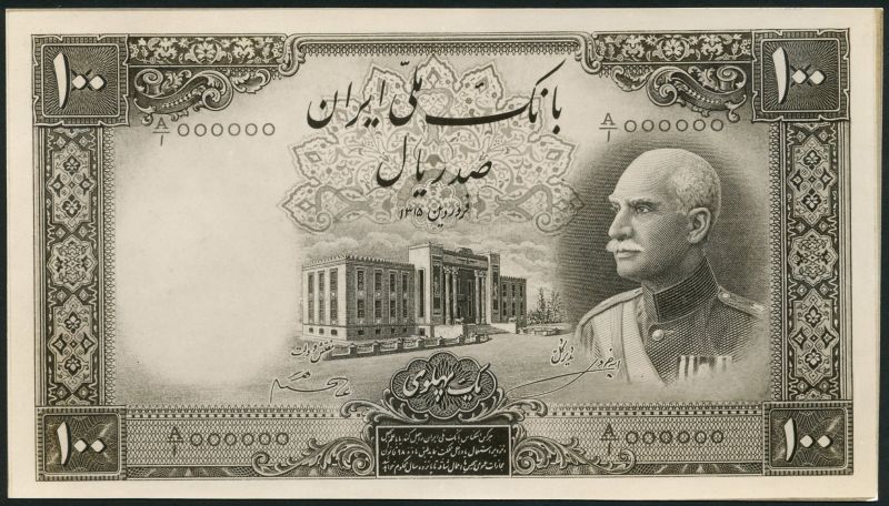 (†) Bank Melli, obverse and reverse photographic style black and white proof for a 100 Rials, ND (1936), serial number A/1 000000, portrait of Shah Reza in profile without cap at right, bank building at centre, reverse steamship and sailing boat at lower centre, crowned arms at upper left