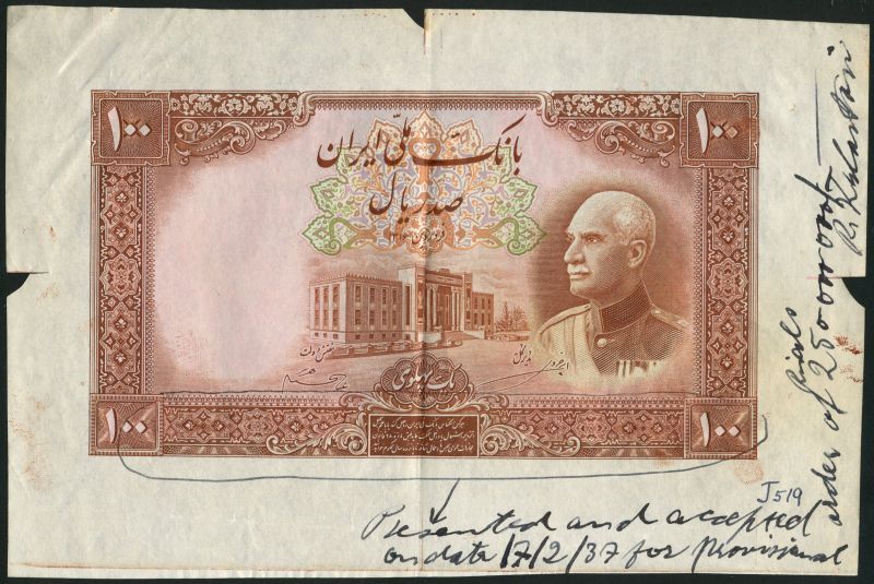 (†) Bank Mellie Iran, obverse and reverse uniface proof on large format paper for a 100 rials, AH 1316 (1937), no serial numbers, brown, green and pink, Shah Reza at right, Bank head office at centre, value at each corner, reverse brown and white, steam yacht and boat at centre, Imperial arms top left, value at each corner