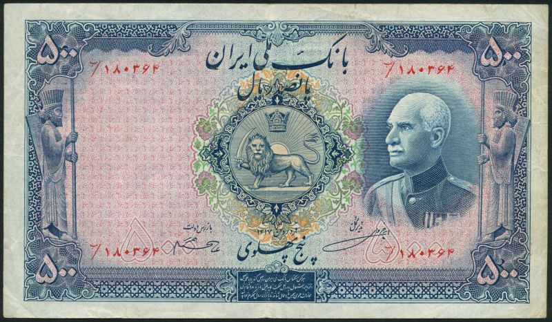 Bank Melli Iran, 100 rials, AH 1317 (1938), Persian serial numbers, brown and multicoloured, Shah Reza at right, building at centre, reverse brown, steam yacht at centre, purple handstamp and date 1320, also 500 rials, AH 1317 (1938), red Persian serial numbers, blue and multicoloured, Shah Reza at right, crowned lion at centre, reverse blue, the Tomb of Cyrus the Great at centre, red handstamp with date 1319
