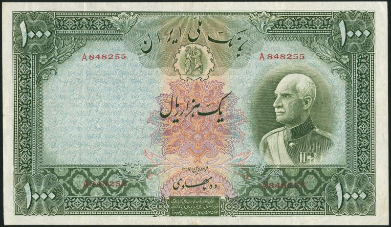 Bank Melli Iran, 1000 rials, AH 1317 (1938), red serial number A 848255, green and multicoloured, Shah Reza at right, value at each corner, reverse green, Mount Damavand at centre, value at each corner