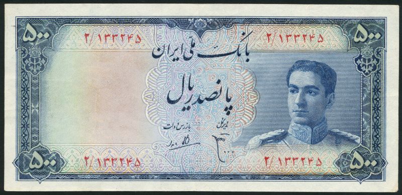 Bank Melli Iran, 500 rials, ND (1951), red Persian serial numbers, blue and multicoloured, Shah Pahlavi at right